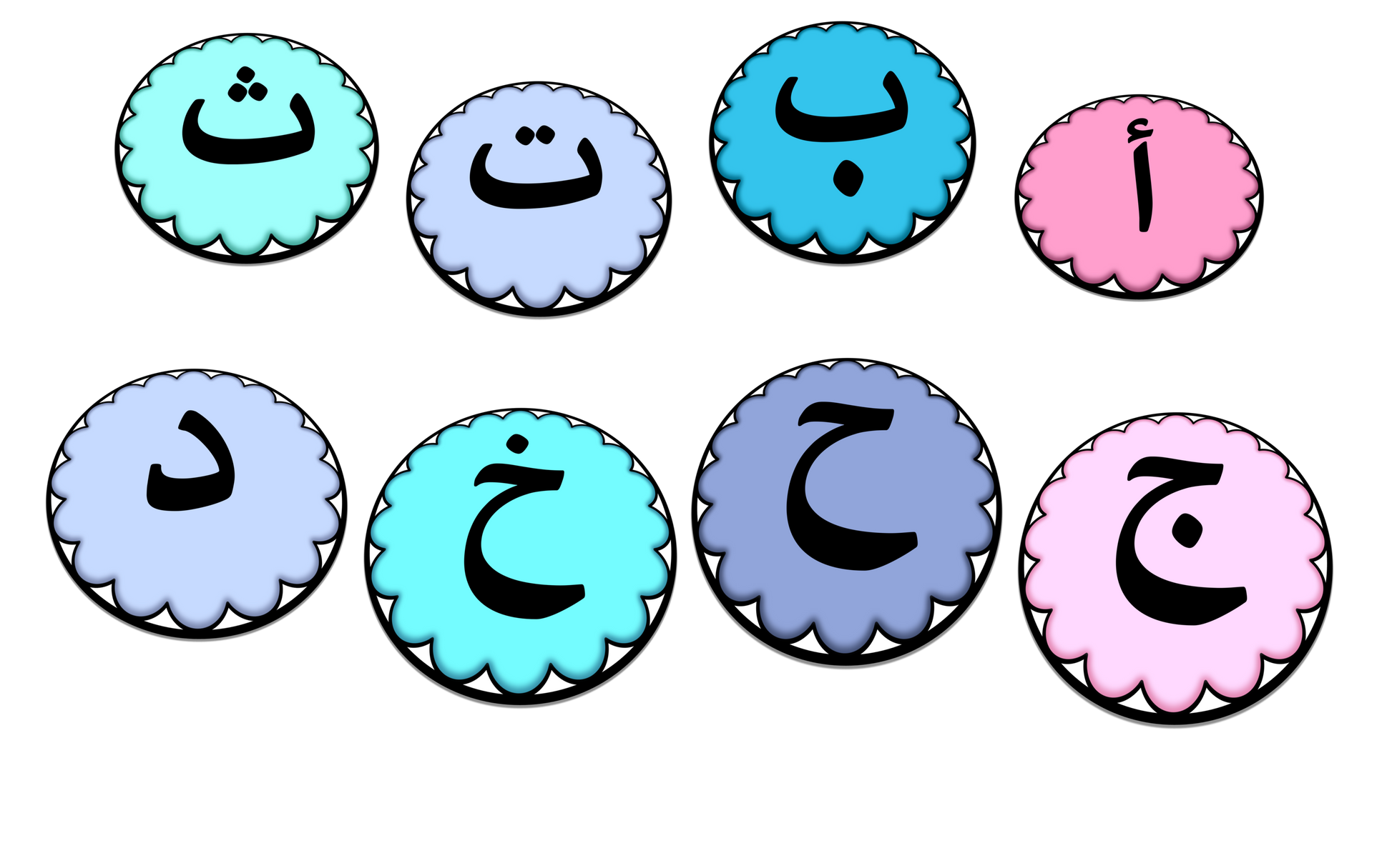 تحتوي على 28 بطاقة كبيرة للحروف الأبجدية وبطاقتين للحروف الأبجدية مع سهم للتدوير.