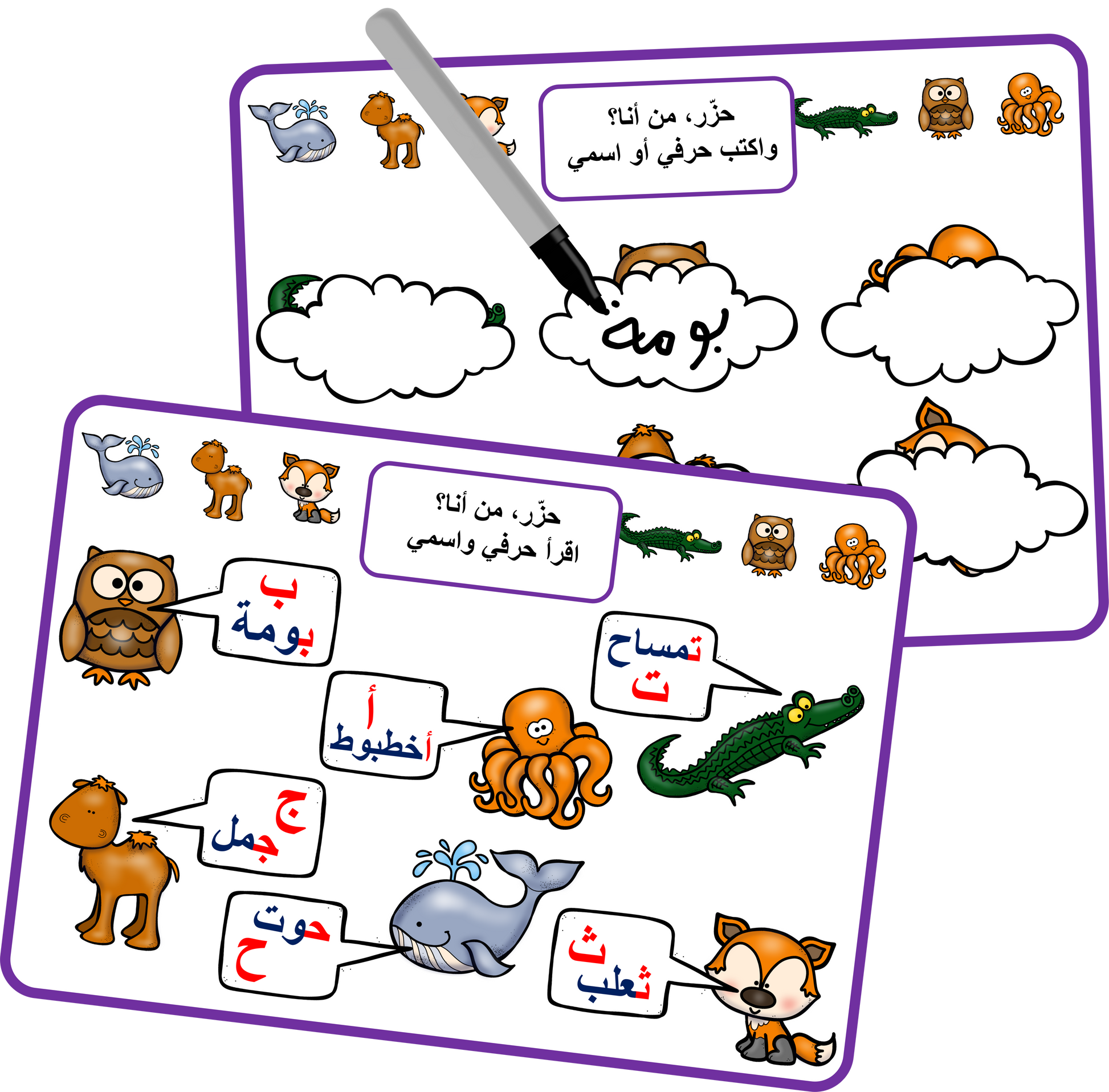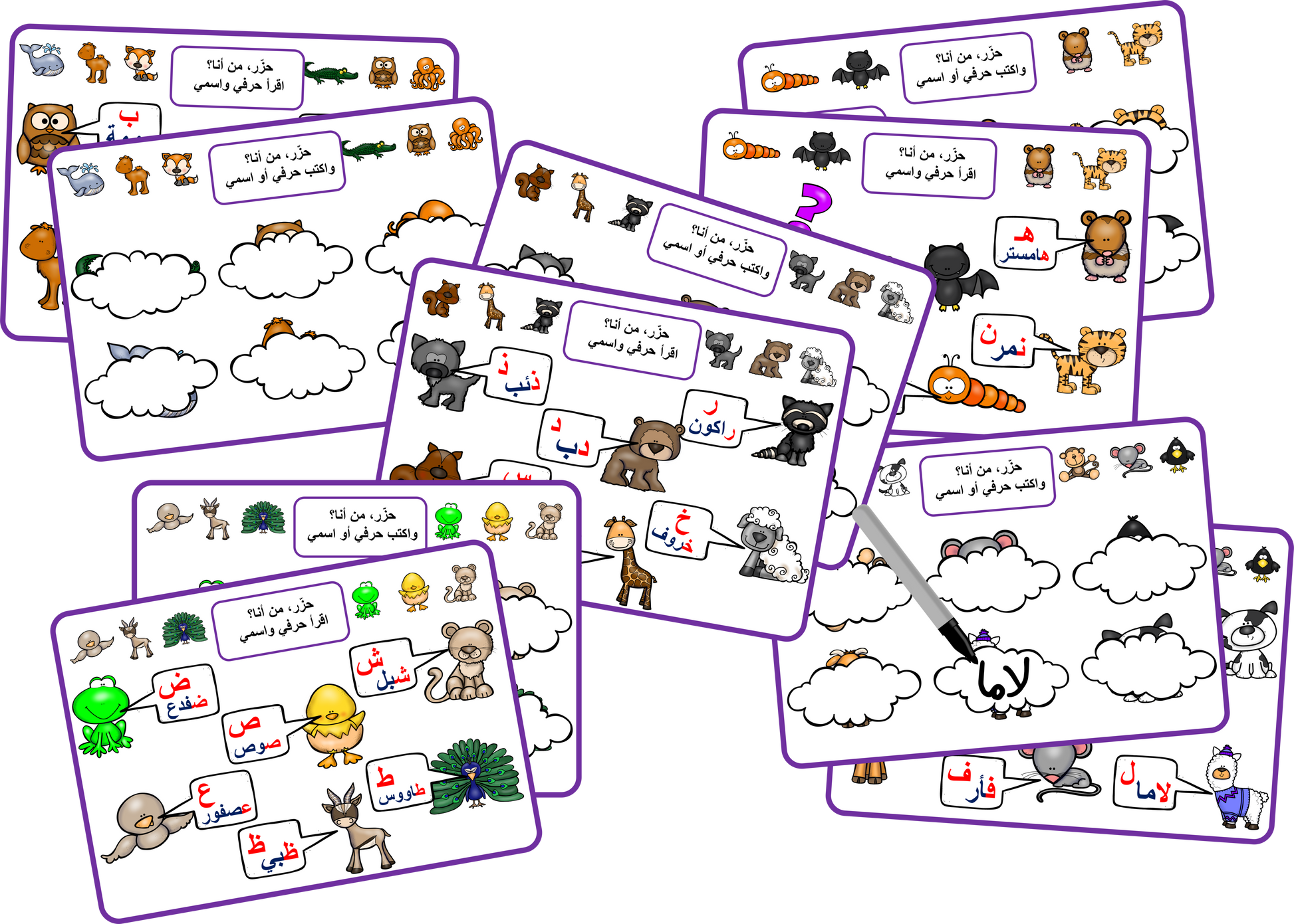 تحتوي على 6 لوحات A3 لتعليم أسماء الحيوانات وحروفها، و6 لوحات A3 لكتابة أسماء الحيوانات أو حروفها.